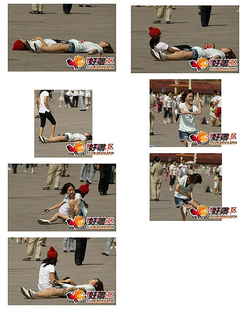 先月、龍仁市(ヨンインシ)の某ペットショップが、天安門のパロディー看板で中国ネチズン達のまな板の上がった事に続き、今度は天安門でいわゆる『死体ごっこ』をしているカン・ミヨン(簡美妍)さんの写真が、中国ネチズンの標的となった。同時に、上海に訪問した海軍の国旗の大きさを比較した写真まで提示しながら、「韓国が中国を無視する」と責めて出るなど、中国ネチズン達の韓国非難がますます激しくなっている。