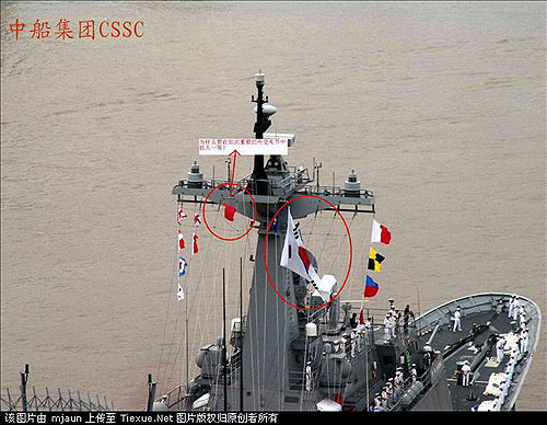 「軍艦が親善訪問する場合、外国の水域では本国の国旗と同等な大きさを掲げ、相手を尊重する」